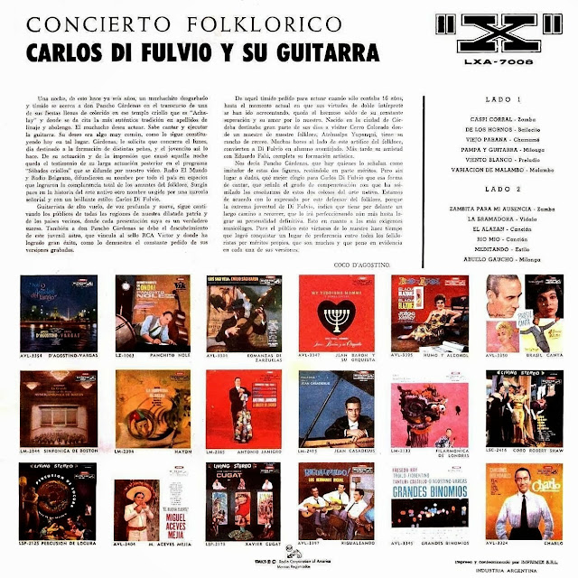 Hoy último domingo de este año 2018 que ya nos deja, voy de nuevo a compartir con todos los queridos amigos seguidores y visitantes, este DISCAZO del genial don Carlos Di Fulvio, grabado en 1960 y editado por RCA Víctor al año siguiente 1961 "Concierto folklórico", encontrado hace unos años en la Web y que estaba cuidadosamente guardado en mi audioteca de DVD. Es el segundo registro discográfico de larga duración del maestro Di Fulvio, en su dilatada carrera artística de más de 50 años. Contiene doce excelentes temas, ocho interpretados con su juvenil y grave voz acompañándose en guitarra y cuatro instrumentales en solo de guitarra, como "De los hornos", "Zambita para mi ausencia" y "El alazán" entre los primeros (voz y guitarra) y "Variaciones de malambo" entre los instrumentales, por ejemplo. Una verdadera joya de colección que RECOMIENDO PARA OÍR Y DISFRUTAR. Los invito pues a que pasen y vean, descarguen y escuchen este álbum maravilloso. Yo les puedo asegurar... Que no se van a arrepentir...!!!.