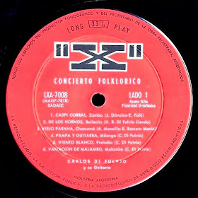 Hoy último domingo de este año 2018 que ya nos deja, voy de nuevo a compartir con todos los queridos amigos seguidores y visitantes, este DISCAZO del genial don Carlos Di Fulvio, grabado en 1960 y editado por RCA Víctor al año siguiente 1961 "Concierto folklórico", encontrado hace unos años en la Web y que estaba cuidadosamente guardado en mi audioteca de DVD. Es el segundo registro discográfico de larga duración del maestro Di Fulvio, en su dilatada carrera artística de más de 50 años. Contiene doce excelentes temas, ocho interpretados con su juvenil y grave voz acompañándose en guitarra y cuatro instrumentales en solo de guitarra, como "De los hornos", "Zambita para mi ausencia" y "El alazán" entre los primeros (voz y guitarra) y "Variaciones de malambo" entre los instrumentales, por ejemplo. Una verdadera joya de colección que RECOMIENDO PARA OÍR Y DISFRUTAR. Los invito pues a que pasen y vean, descarguen y escuchen este álbum maravilloso. Yo les puedo asegurar... Que no se van a arrepentir...!!!.